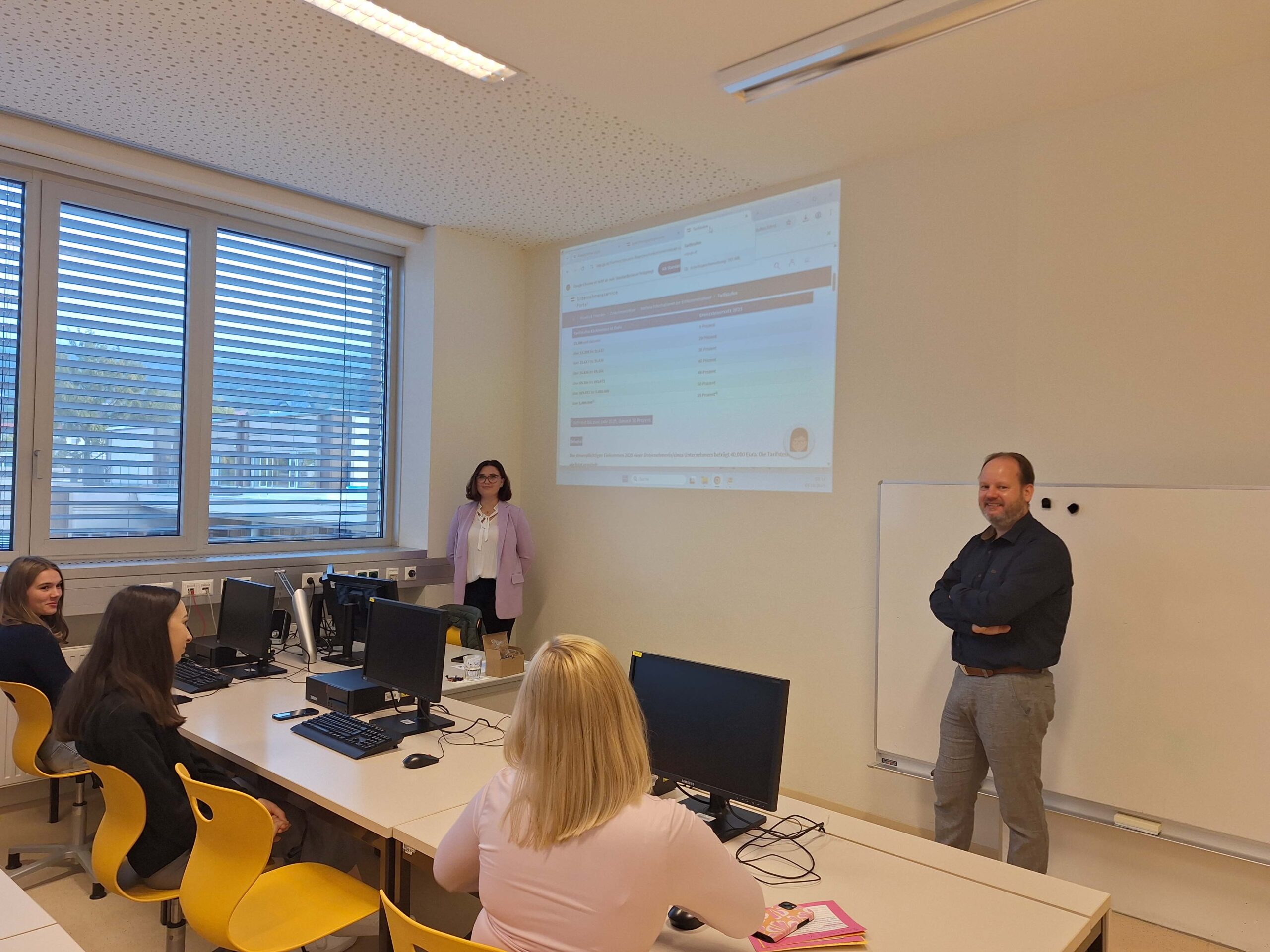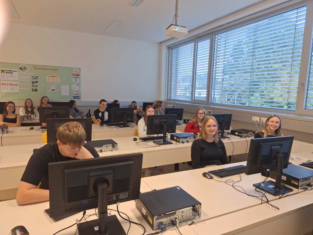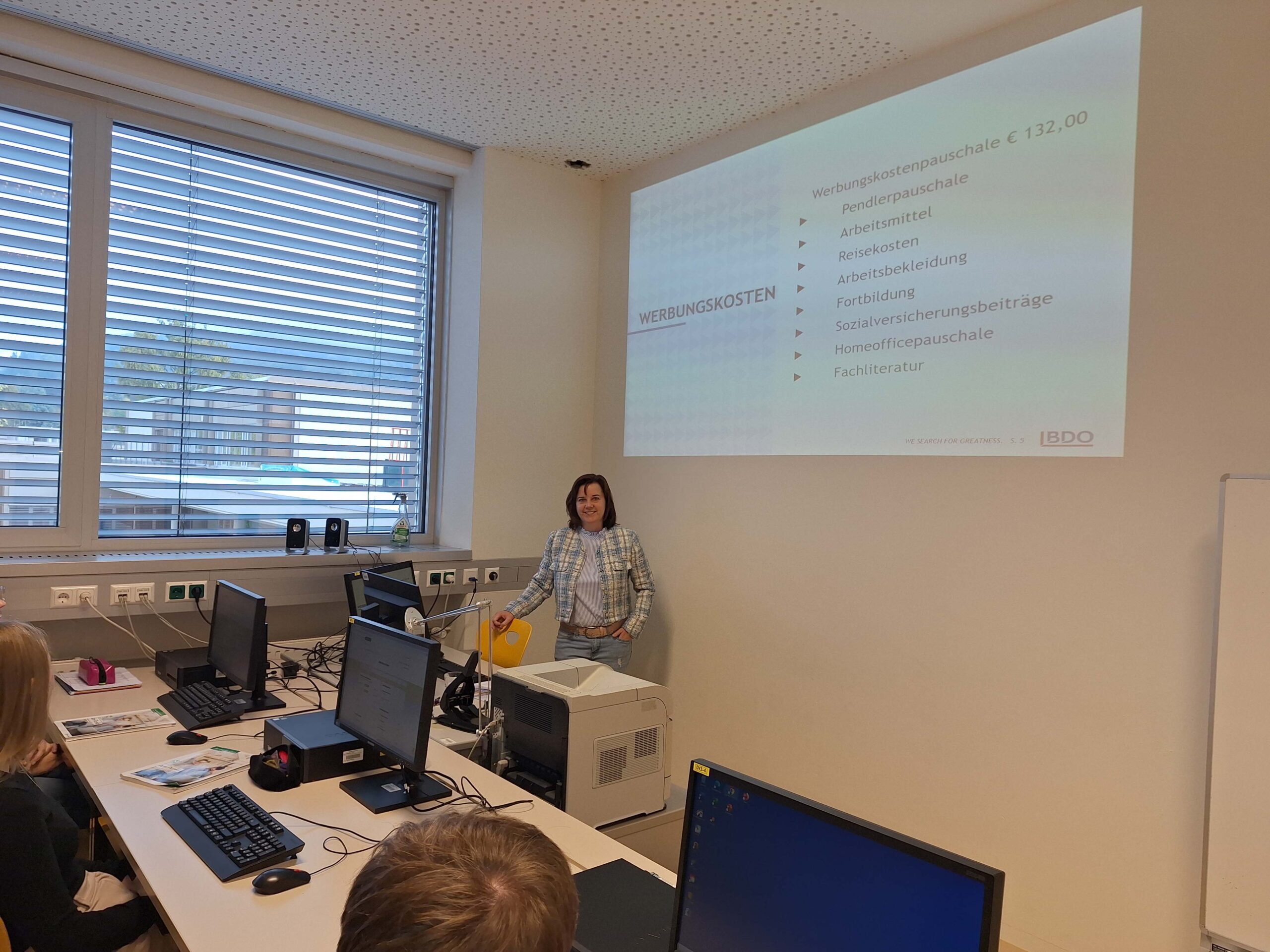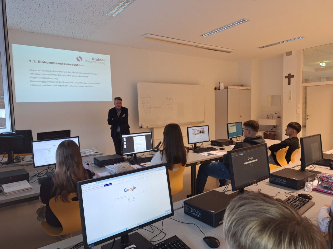 Der Workshop wurde in drei EDV-Räumen abgehalten, sodass die Maturant:innen aktiv mitarbeiten und die Inhalte praxisnah erproben konnten. Unter der fachkundigen Leitung von Frau Jöbstl von der BDO Wolfsberg, Herrn Alois Krainer, MSc, MBA und Herrn Mag. Georg Krall und seiner Assistentin Frau Julia Spanner, einer erfolgreichen Absolventin der HLW Wolfsberg, erhielten die Schüler:innen fundierte Informationen über den Ablauf und die Bedeutung des Lohnsteuerausgleichs.